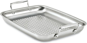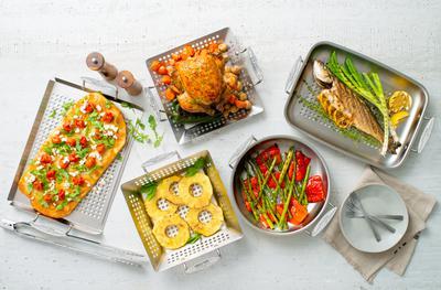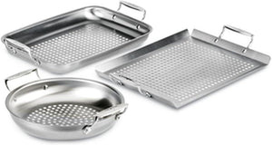 Ideal for grilling a variety of vegetables, meat and seafood, the All-Clad stainless outdoor 3 piece set includes a 11” Round Grill Basket, 16” x 12” Grill Grid and 15” x 11” Grill Roaster. The angled sides of the cookware allow for easy tossing and stirring. The large perforations help create delicious smoky flavour and won’t clog from marinades, yet prevent smaller foods from falling through.