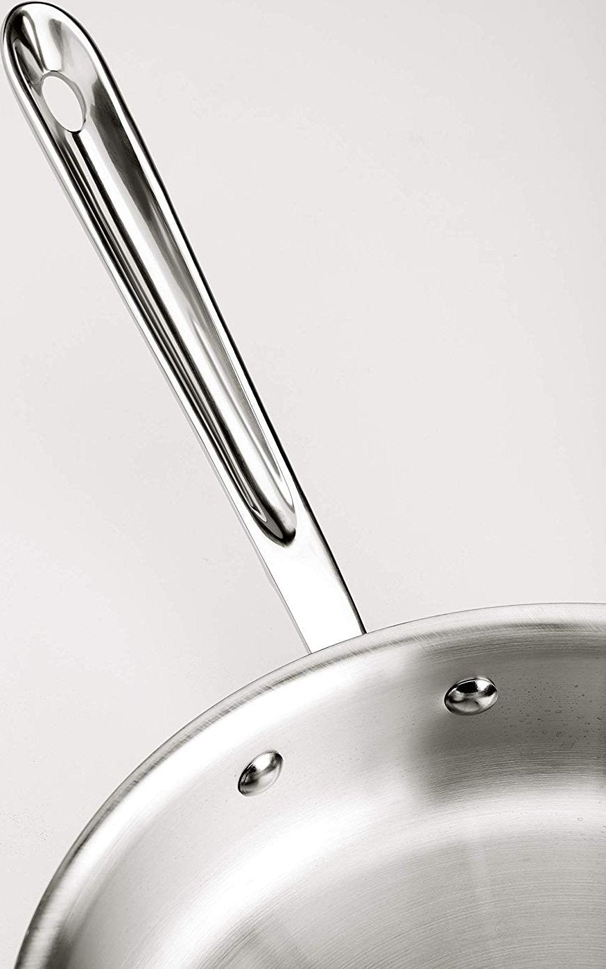 All-Clad’s Stainless 3-ply cookware features a thick-gauge aluminum core that attracts heat fast, while the addition of stainless steel ensures even heat distribution for consistent results across the entire cooking surface, all the way to the rim. Even more, its stainless-steel interior with a starburst finish offers natural stick resistance, letting you know when food is ready to release, and it won’t react with ingredients, so there’s no risk of food picking up a metallic taste.