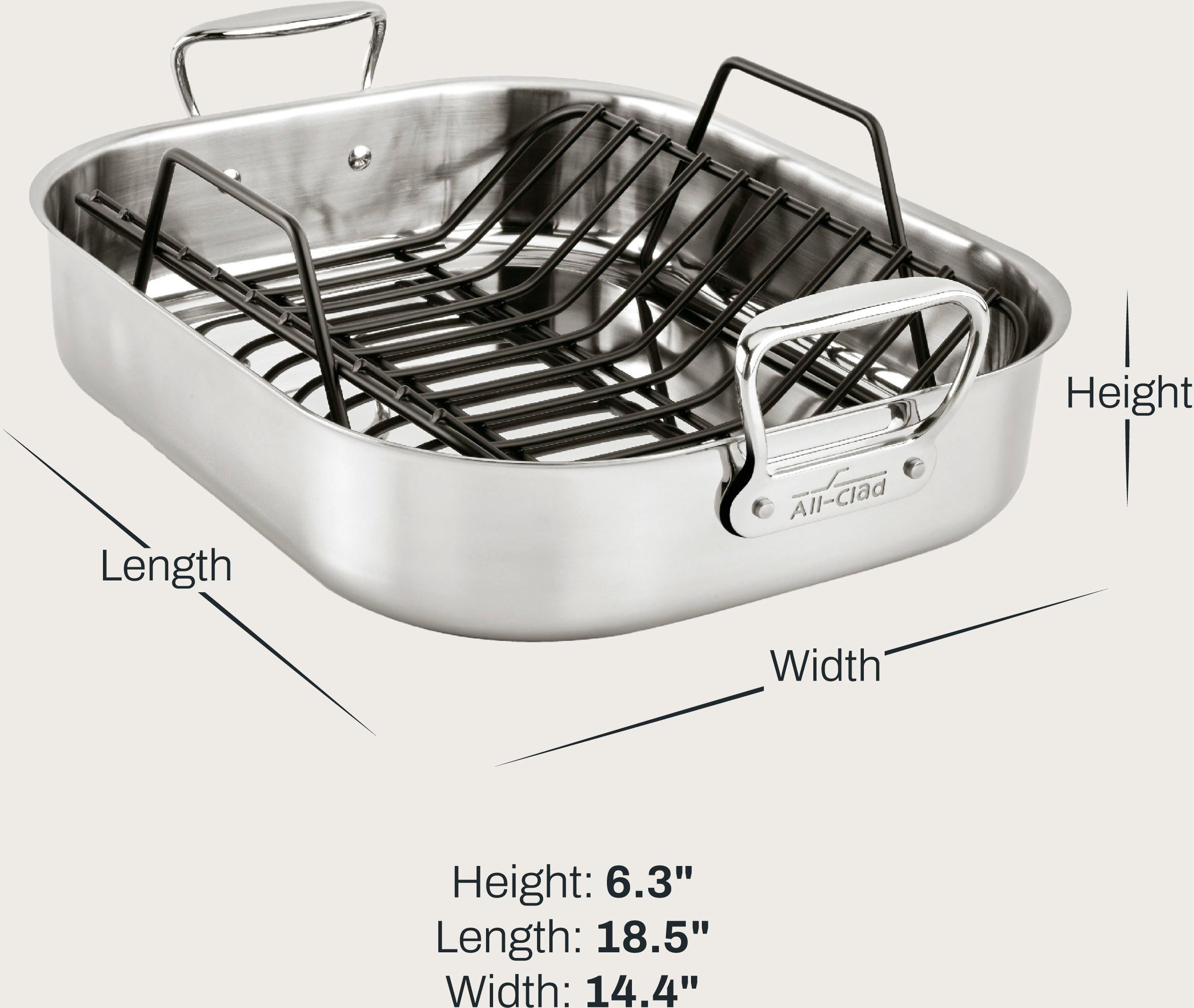 • This All-Clad Large Stainless Steel Roaster with Rack, 13 x 16 inch provides ample space for all your roasting needs, ensuring you can cook large cuts of meat or multiple dishes simultaneously.