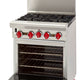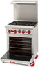 American Range, restaurant range size 24" x 32-1/2" x 56" Stainless steel front, sides, backriser, shelf and 6" adjustable legs. Removable full width drip pan. Choose 32,000 BTU/hr. open burners with anti-clog lift-off burner heads or 20,000 BTU/12" section griddle or a combo burner griddle. Heavy-duty cast iron grates, 12" x 12". Burner knobs are cool to the touch, high temperature material. One oven: 27,000 BTU/hr. standard oven, 30,000 BTU/hr. for innovection with porcelain interior and inside door panel, oven interior measures 20"W x 26-1/2"D x 13-1/2"H. Oven thermostat adjusts from 250°F to 500°F. All ovens supplied with two racks. Oven door with a spring assisted, counterweight mechanism requiring no adjustment. Rear gas connection and pressure regulator.