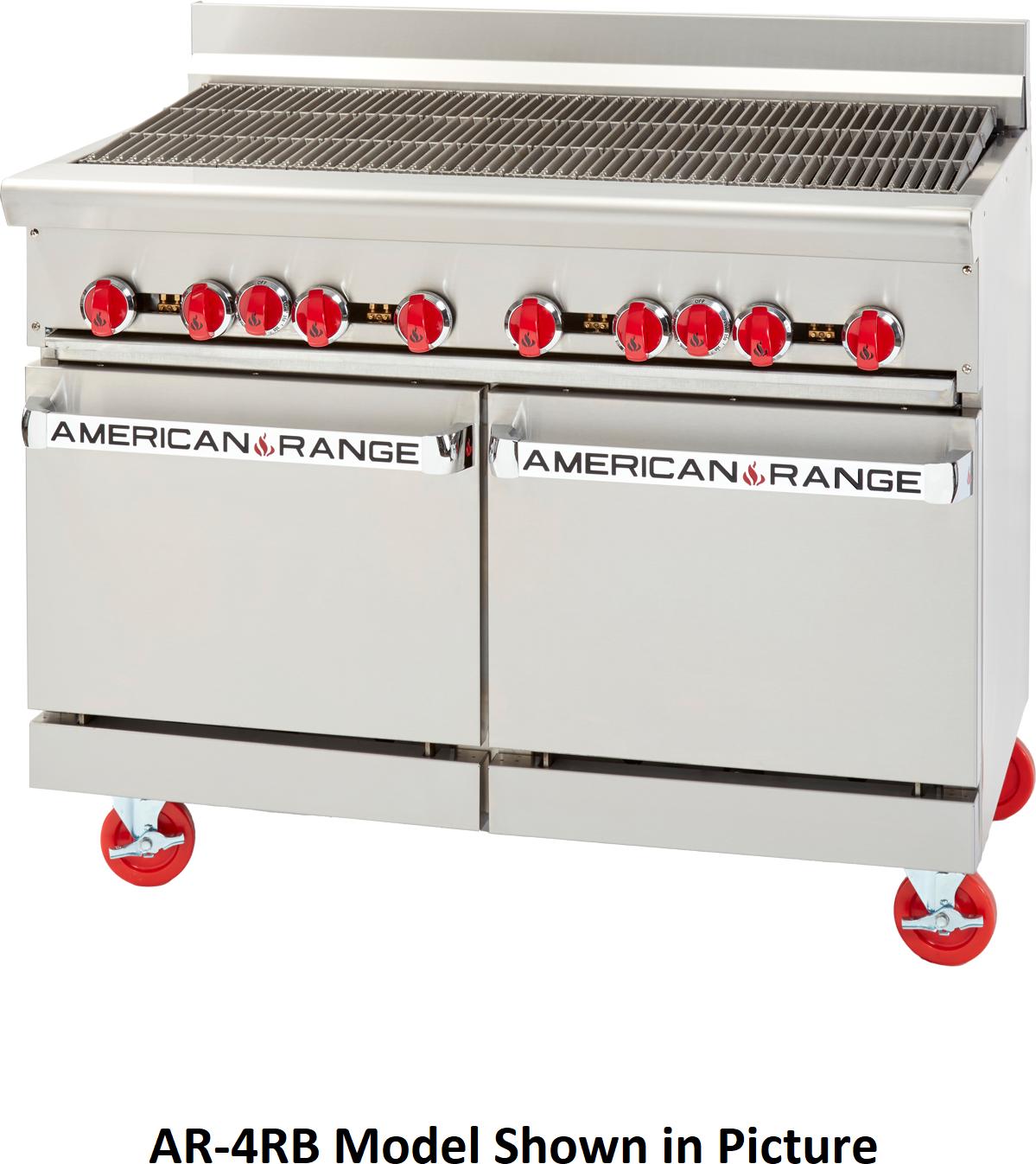 American Range, radiant broiler with oven base, (Space Saver Oven 24″), 36″, 48″ wide. Height of unit is 38" Stainless steel front, sides, backriser, shelf and 6" adjustable legs. Removable full width drip pan. Equipped with one 15,000 BTU rated steel burner at every 6" width. Heavy-duty reversible cast-iron top grates. Burner knobs are cool to the touch, high temperature material. One oven: 35,000 BTU/hr. standard oven, 30,000 BTU/hr. for convection or innovection with porcelain interior and inside door panel, standard oven interior measures 26-1/2″W x 22-1/2″D x 13-1/2″H and Space Saver oven interior measures 20″W x 26-1/2″D x 13-1/2″H. Space Saver oven is 27,000 BTU/hr. All oven thermostats adjusts from 250°F to 500°F. All ovens supplied with two racks. Oven door with a spring assisted, counterweight mechanism requiring no adjustment. Rear gas connection and pressure regulator.