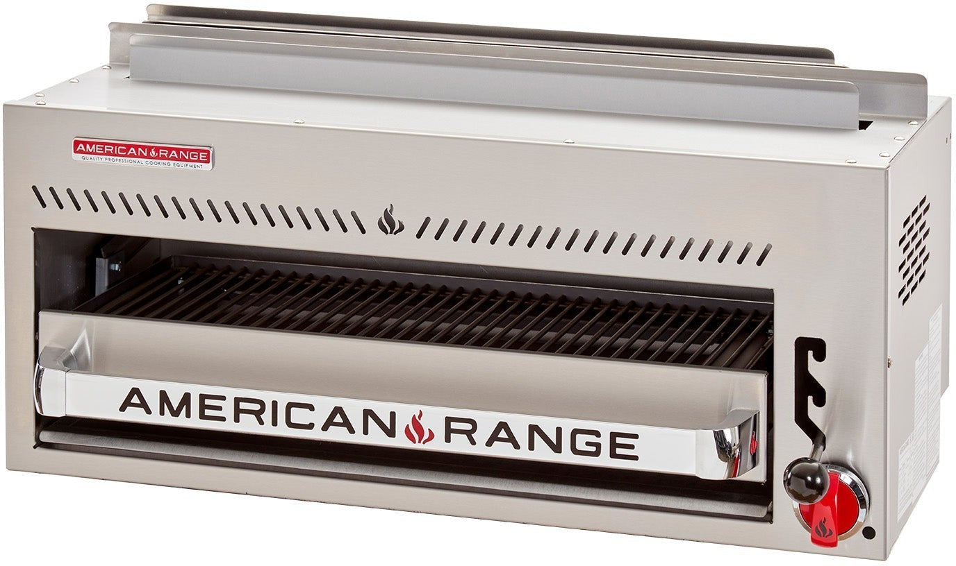 American Range, Salamander Broiler choose either single controls ARSM-24 or ARSM-36 or dual controls ARSB-36. The 24" unit has 25,000 BTU/hr. and both 36" units have 30,000 BTU/hr. infrared adjustable burners. Three level adjustable cooking grate. Grate rolls out for easy loading and unloading. Includes large capacity grease tray and stainless steel front and sides.