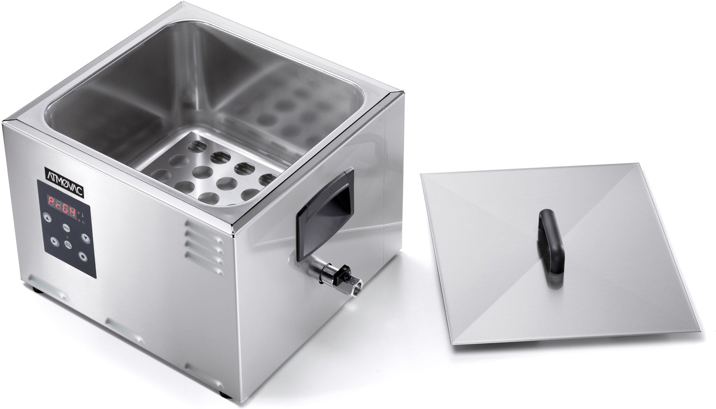 Integrated baths for sous-vide by ATMOVAC offer excellent temperature stability and reliability. Sous-vide cookers offer an excellent temperature stability, reliability and flexibility. Bright LED display visualizes temperature and working time. Temperature range from 30°C to 100°C with an accuracy of 0.3°C. The five programs allow you to save your favorite recipes. Features a compact space-saving design with practical handles to carry it easily. Equipped with a factory-fitted drain valve so the unit can be easily drained and cleaned.