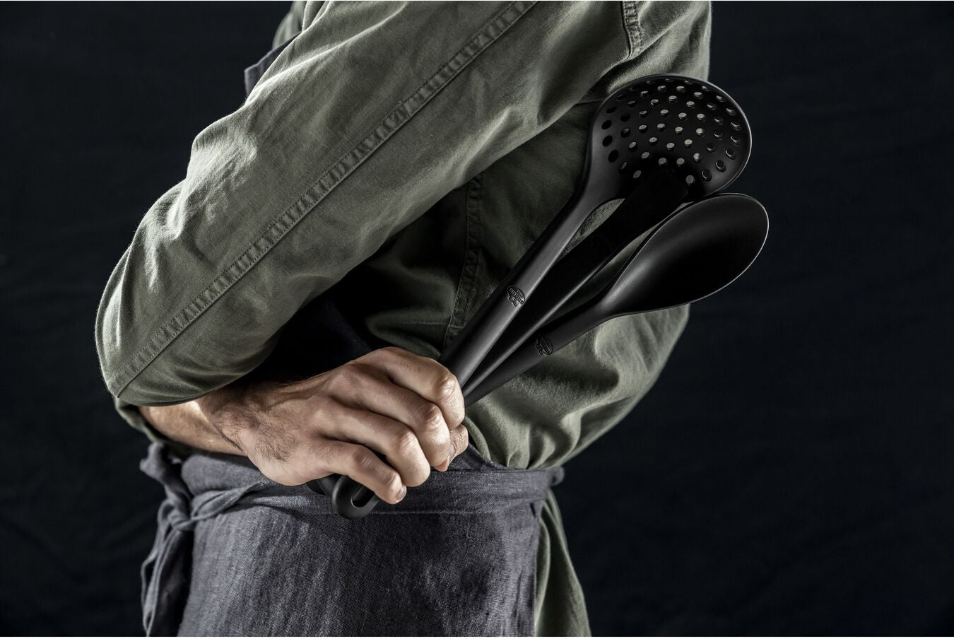 Non-stick pots and pans are also grateful for its flexible material that's gentle on the coating of cookware. The food-grade silicone is also heatproof up to 230°C. When handling hot salsa or 'zuppa', the ergonomically designed handle sits securely and comfortably in the hand. Thanks to the practical hanging hole, you can hang the skimming ladle on your kitchen rail. The mini kitchen marvel is naturally also dishwasher-safe. No ungainly edges or corners guaranteed. The curvy design with rounded handle end and the elegant black colour is by Milan-based studio Matteo Thun & Antonio Rodriguez.