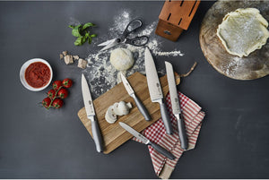 All the knives are dishwasher-safe – although we recommend gently cleaning them by hand. The incredible sharpness, cutting edge retention and corrosion resistance of the German stainless steel blades are testament to their simply meraviglioso quality. The knives also feature stainless steel handles and look beautifully elegant. The matte surfaces of the sandblasted handles elegantly contrast against the polished surfaces of the bolsters and handle ends. Helping ensure that they retain their sharpness, the knife block also serves to protect the blades. It is also ideally suited as a safe place to store the scissors.