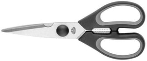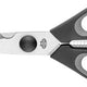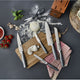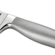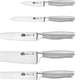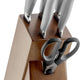 The knife set includes a chef’s knife (20 cm blade), a bread knife (20 cm blade), a carving knife (16 cm blade), a utility knife (13 cm blade), a larding and garnishing knife (9 cm blade) and a pair of all-purpose kitchen scissors.