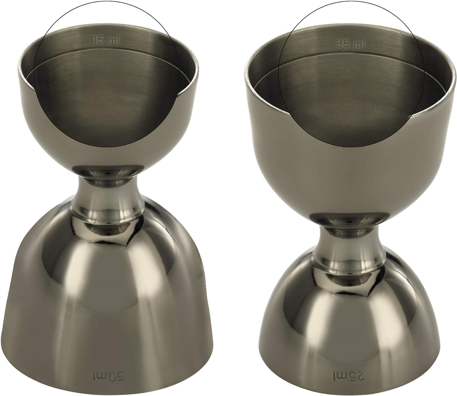 The heavy-duty construction of these jiggers ensures their longevity and reliability, making them ideal for use in busy bars, cocktail lounges, and other hospitality settings. Designed to withstand frequent use and regular cleaning, these jiggers are built to endure the demands of professional bartending, providing bartenders with a reliable tool they can count on during busy shifts. The straight rim bell design of these jiggers offers versatility and precision in cocktail preparation. Featuring dual-sided measurements of 25 ml and 50 ml, bartenders can easily measure out precise quantities of ingredients for a wide range of cocktails, ensuring consistency and accuracy in every pour. The straight rim allows for effortless pouring and minimizes spills, making it easier for bartenders to maintain a clean and efficient workspace.