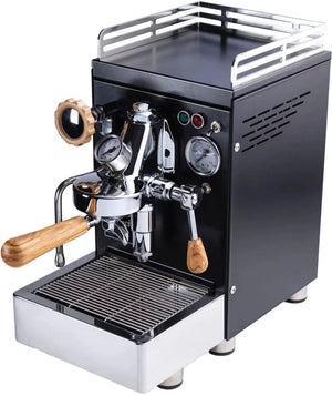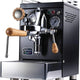 - Chrome-plated brass E61 group, thermosiphon system, stainless steel brewing bell and cap
