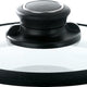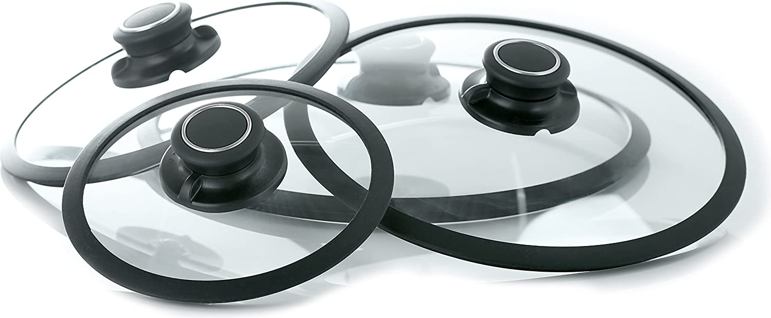 High quality tempered glass lid with with full silicone rim; fits any 12.5-inch or any 32 cm cookware. Features an adjustable vented knob on top that allows control of steam release.
