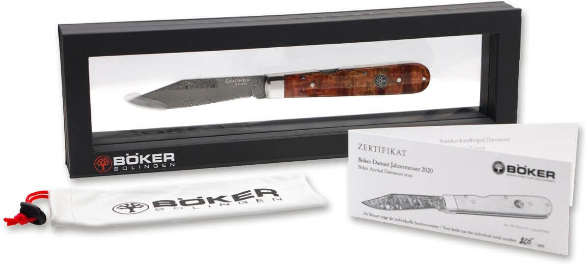 The choice for the Boker Annual Damascus 2020 was the 1906 model, a true Modern Traditional. The new edition of the knife design from the turn of the century before last meets the current zeitgeist and is extremely popular. It is a very charismatic pocket knife, whose special appearance is especially characterized by its straight lines, clear lines and the typical blade grind.