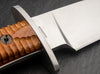 The solid construction in combination with the classic look and high utility value make the Boker Arbolito Esculta, the more compact version of the El Gigante, an excellent companion for outdoor and hunting. The Guayacan ebony scales are equipped with red fiber lines, giving an appealing contrast to the wood grain. The rough and grippy structure is reminiscent of the horns on an Oryx antelope. The ideal knife for outdoor and survival enthusiasts. Stonewash blade finish. The classic look of the material in combination with the extremely practical Stonewash blade finish make the Bowie an extraordinary knife not only for use but also for collectors. The solid Böhler N695 steel blade runs completely through the grip and tapers toward the pommel. This tapered tang gives the knife a particular visual appeal and provides outstanding balance. The protruding and stout hand guard is made from brushed stainless steel, promising high handling reliability and contributing to the refined appearance. Supplied with high-quality leather sheath.