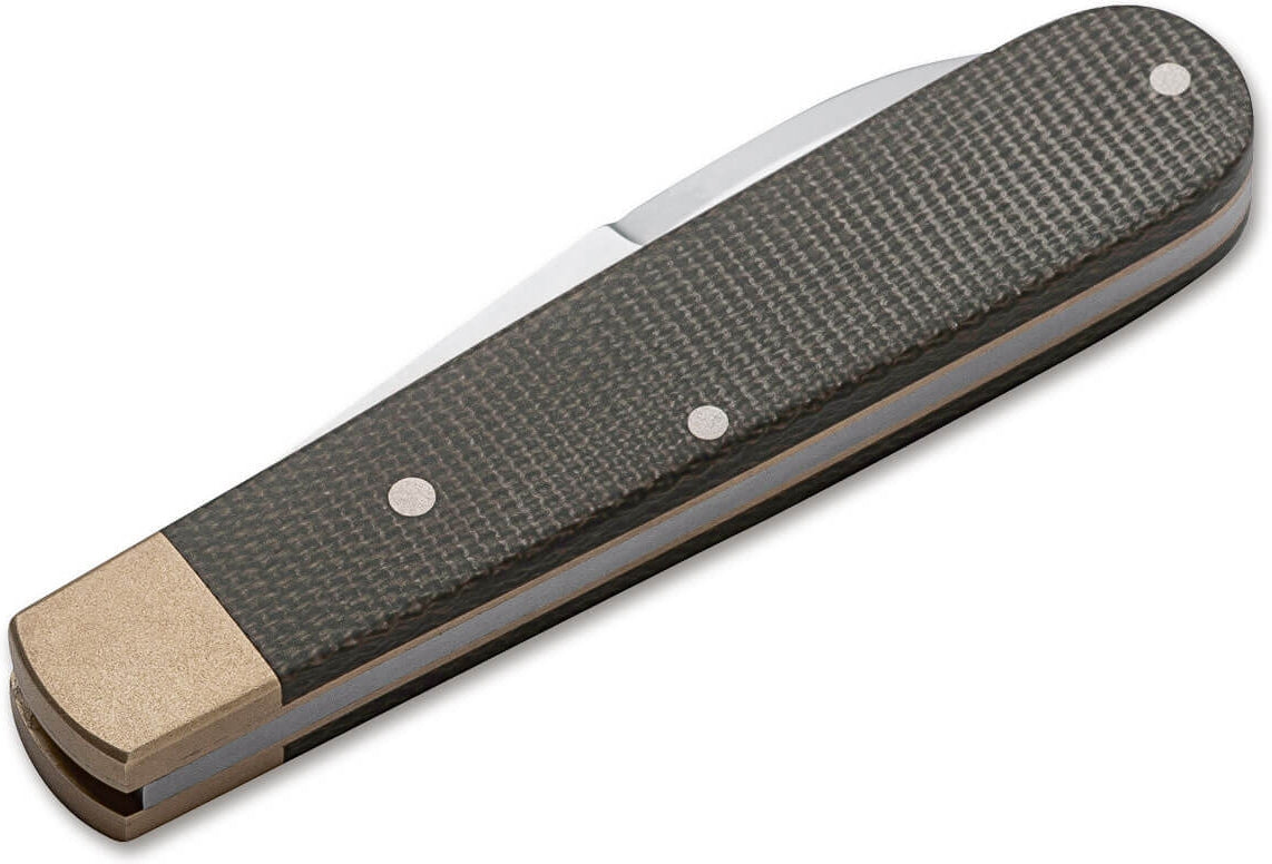 The Boker Barlow Prime, which has significantly shorter bolsters, is equipped in this version with contoured handle scales in olive green Canvas Micarta, while bolster and liners are made of matt blasted brass. The resulting colour contrast is reminiscent of the privation-laden expeditions of discovery in times long past. The satin-finished blade is made of ice-hardened N690 with 60 to 61 HRC, opened and unlocked with two hands by nail nick. It is equipped with a modern, elongated ricasso, the slipjoint's operating safety is increased by a 90° stop when opening and closing. The characteristic teardrop shape of the Barlow can be traced back to the English pocket knives of the 17th century, making it certainly one of the oldest models of all. Handmade in the Boker knife manufactory Solingen.