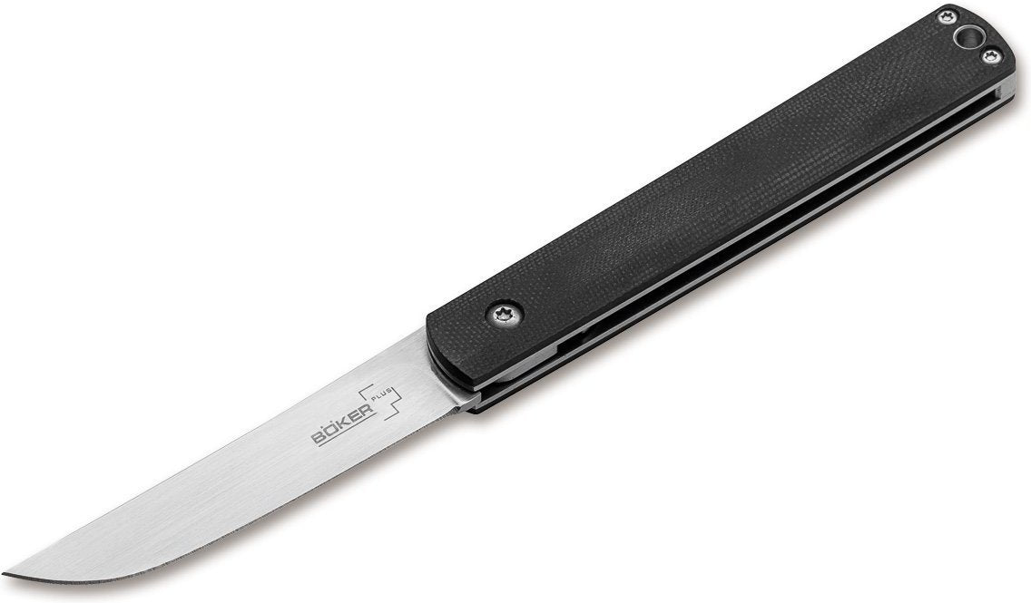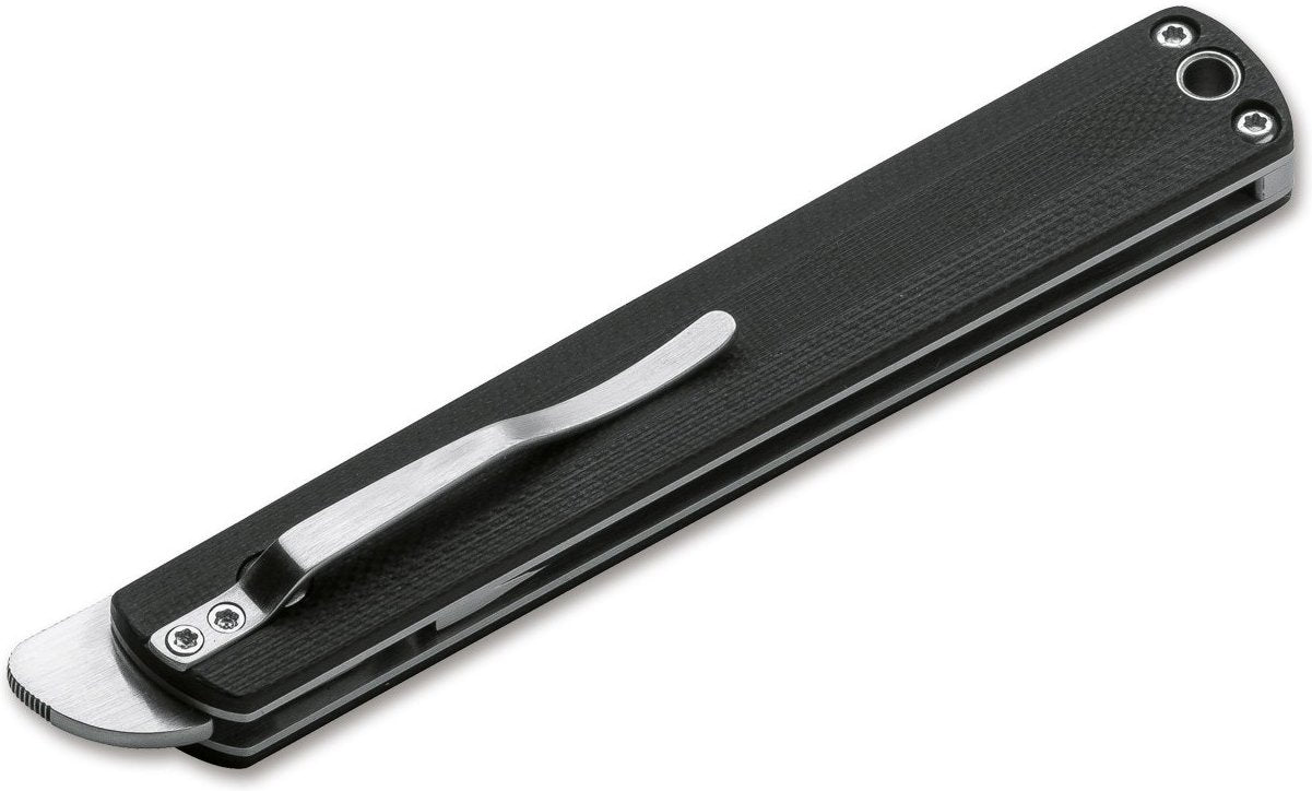 The slender build and lightweight construction of the Boker Plus Wasabi complement the straightforward design and classic Japanese blade to make an elegant everyday knife. The blade with ball bearings opens with a front flipper and is kept open as a slipjoint with a detent ball. The blade is made of reliable 440C. Handle with stainless liners and milled clip. Scales of black G10.