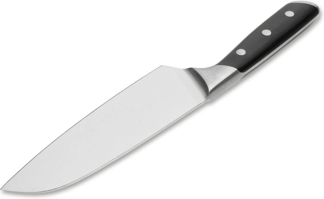 The Kitchen Knife line Boker Forge combines innovative and dynamic designs with a classic material selection, at a premium quality level. The attractive, eye-catching design lines distinguish this series significantly from the masses of average kitchen knives, without being too flashy. In addition, the Boker Forge series is convincing with a very attractive price-performance ratio. The knives are made from X50CrMoV15 chrome-molybdenum-vanadium stainless steel, are ideally balanced and provide perfect handling due to the ergonomic grip design. Black handle scales made of special high-quality ABS synthetic material are durably combined with three stainless steel rivets and are attached to the completely continuous tang without rivets. The design of the blades, including the transition to the bolster, allows easy sharpening and ensures long-term perfect function for the knives in combination with proper care. Please only hand wash the knives, do not place in dishwasher. The knives are delivered in a high-quality gift box.