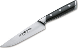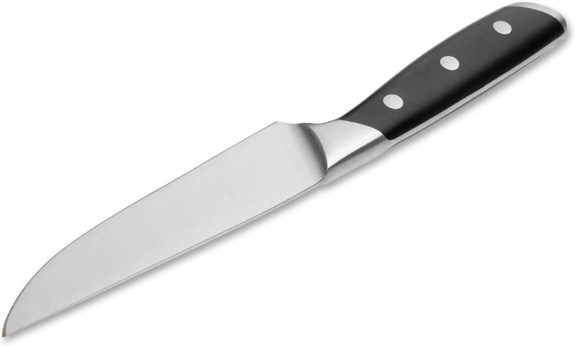 The Kitchen Knife line Boker Forge combines innovative and dynamic designs with a classic material selection, at a premium quality level. The attractive, eye-catching design lines distinguish this series significantly from the masses of average kitchen knives, without being too flashy. In addition, the Boker Forge series is convincing with a very attractive price-performance ratio. The knives are made from X50CrMoV15 chrome-molybdenum-vanadium stainless steel, are ideally balanced and provide perfect handling due to the ergonomic grip design. Black handle scales made of special high-quality ABS synthetic material are durably combined with three stainless steel rivets and are attached to the completely continuous tang without rivets. The design of the blades, including the transition to the bolster, allows easy sharpening and ensures long-term perfect function for the knives in combination with proper care. Please only hand wash the knives, do not place in dishwasher. Moreover, the Boker Forge series convinces with an incredibly attractive price-performance ratio. The knives are delivered in a high-quality gift box.