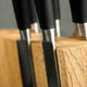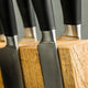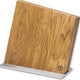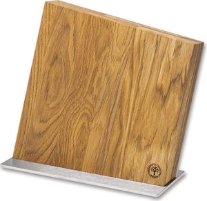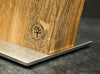 Handmade Knives deserve attractive storage. With its premium material mix of solid natural wood and brushed stainless steel, it is the perfect exclusive accessory for any kitchen. The minimalist, space-saving construction can hold up to eight knives, thanks to hidden magnets. The slanted wooden block stands securely on a solid stainless steel base. Rubber feet on the bottom of the stainless steel plate keep the knife block from shifting and potentially scratching the countertop. The bottom left corner was carefully branded with a subtle Boker logo. Knives not included.