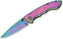 A real eye-catcher! This attractive piece shows off an array of colours on the handle and the 440 stainless steel blade, created by a complex treatment process. The 2.875" blade is held open by a frame lock mechanism. Includes pocket clip and lanyard hole.