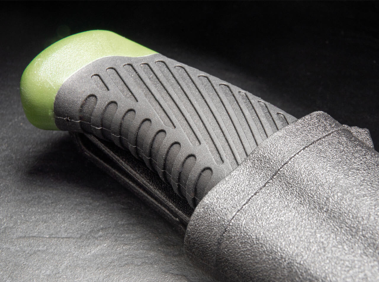 - Olive green, non-slip, textured, rubber coated plastic handle
