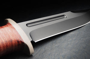 The Magnum Ranger Field Bowie combines a proven knife shape with modern material, because the better is the enemy of the good. According to the American Navy SEALs, the world-famous USMC Bowie is the best knife in the world. Nevertheless, we have dared to improve it with the Magnum RFB. The hilt and end knob are not made of metal as usual, but of lightweight and extremely durable G10. This results in a significant weight reduction and, in combination with the brown handle made of wrapped leather and the black coated blade, gives the knife a modern, attractive appearance. The impressive Bowie blade made of 440A has a characteristic ricaso and a pronounced hollow groove. With high-quality black leather sheath and practical chuck.