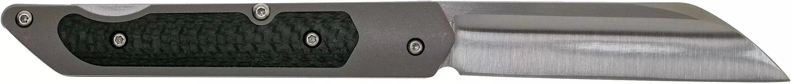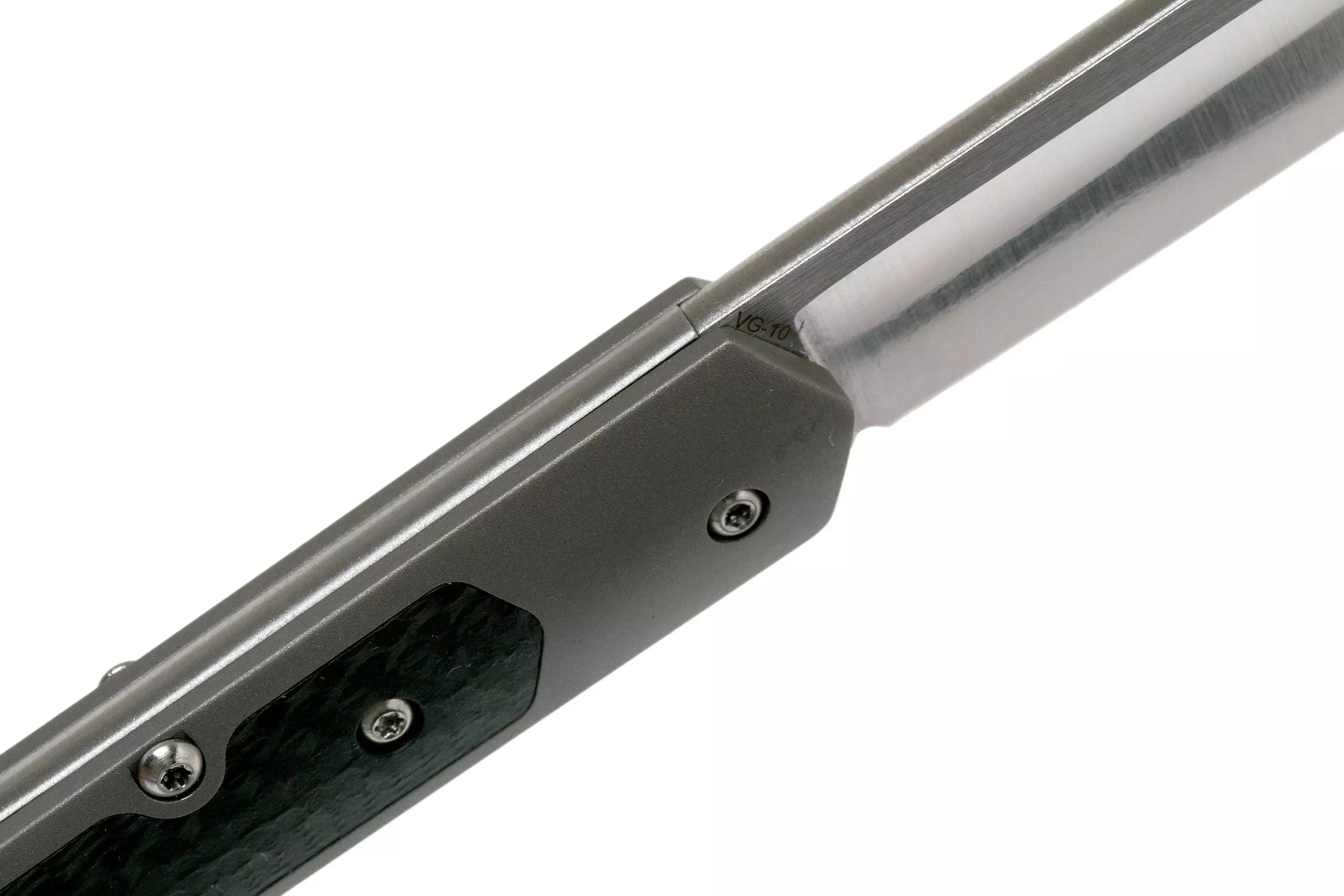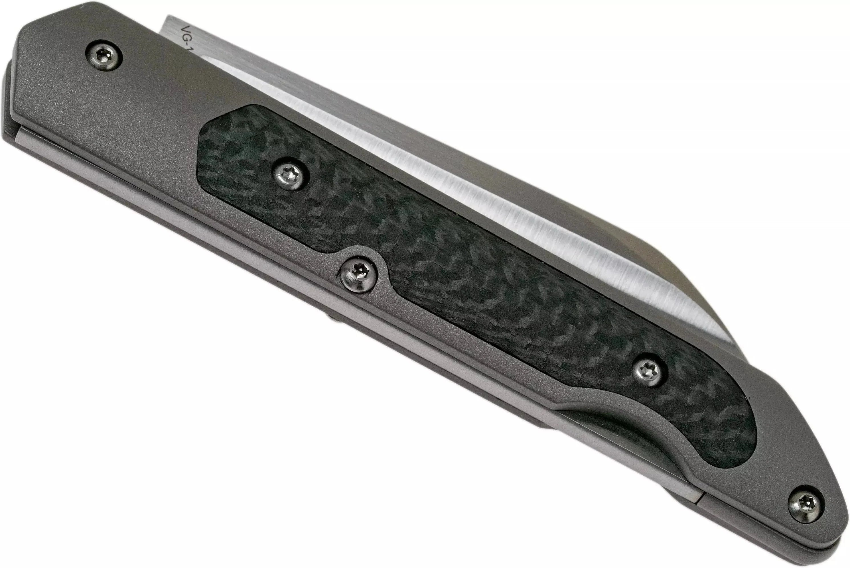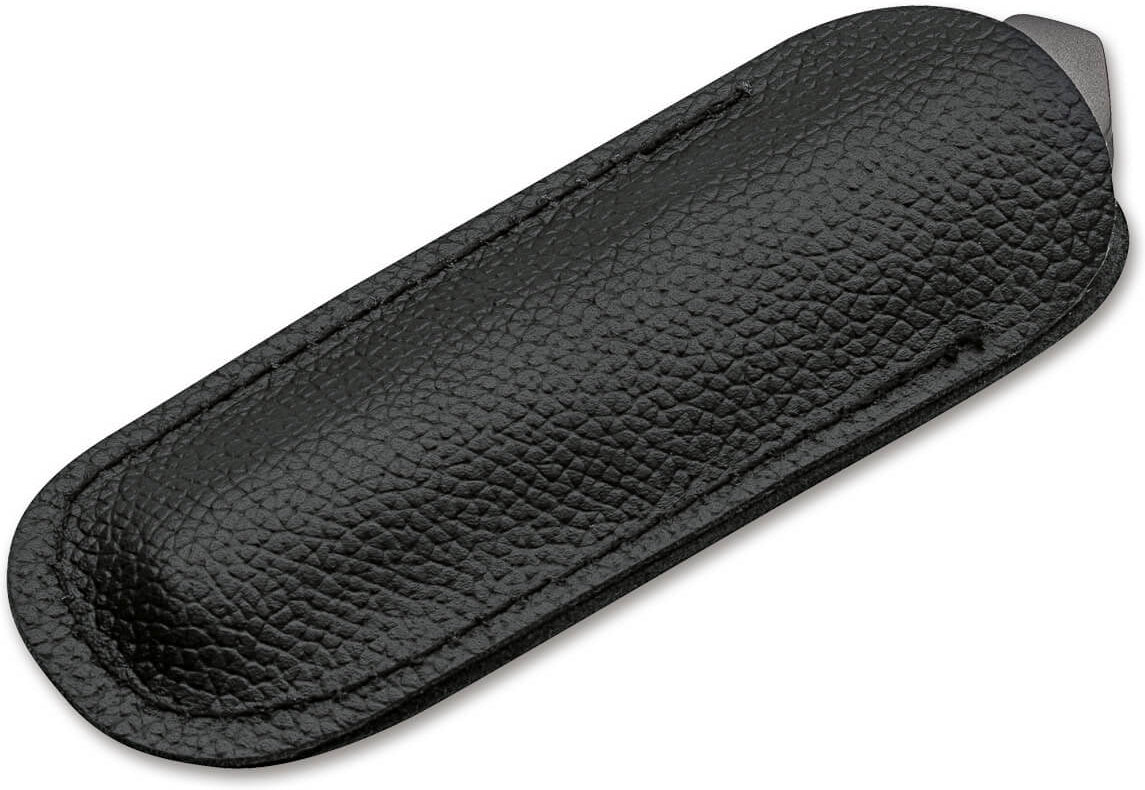 The extremely slim Boker Plus Genios is a modern gentleman's knife with symmetrical lines. The narrow VG-10 sheepsfoot blade has a crowned spine and is secured with a new patented backlock based on a space-saving wire bracket. The lock doesn't need a top spring so that the blade has significantly more room in the handle. The contoured handle of titanium has carbon fiber inlays and forgoes the clip, which reduces the overall weight of the pocketknife. Instead, the Genios comes with a black leather sheath. With high-quality nylon case for storage.