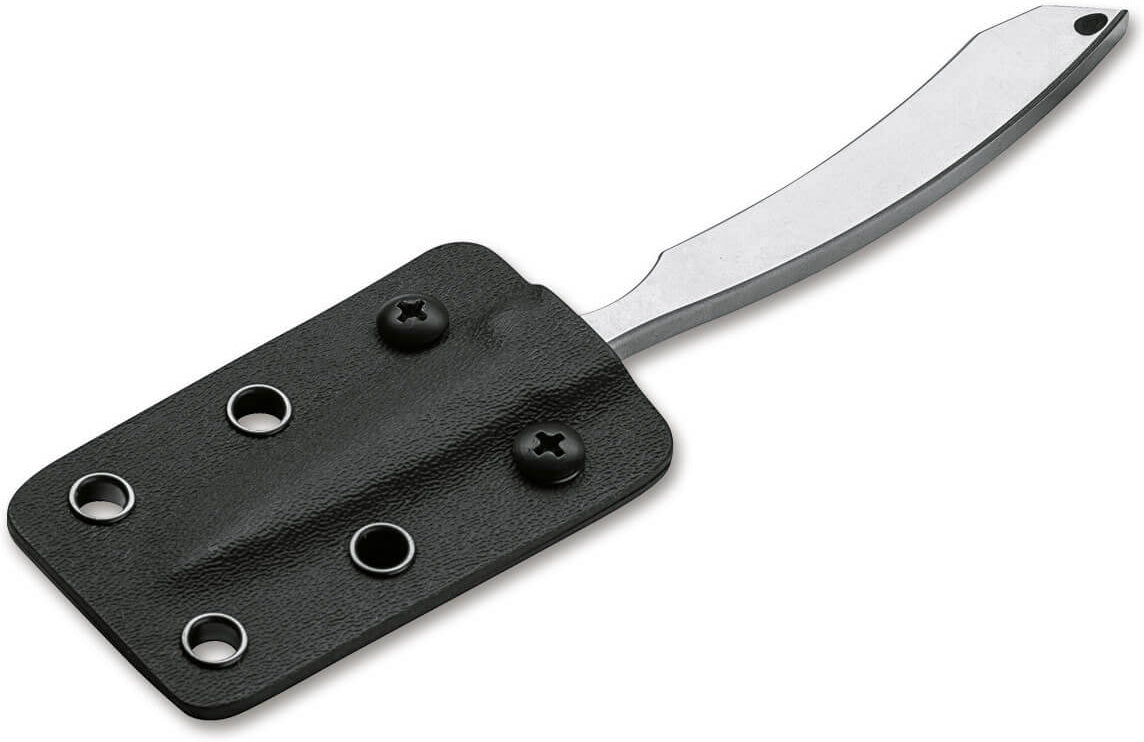 The consistently reduced to the essentials Boker Plus Islero convinces with minimal weight and excellent wearing comfort. The full-steel construction of D2 is provided with a resistant stonewash finish and always lies comfortably in the hand thanks to the ergonomically curved shape. The practical EDC was designed by Charles de Buyer, a young knifemaker from France. The compact Spearpoint blade features a distinctive notch. With a lanyard hole, belt adapter and snug-fitting Kydex sheath.