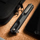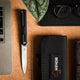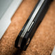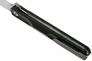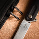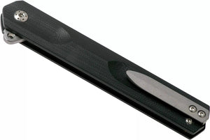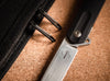 The remarkably slim Boker Plus Kyoto is a modern, lightweight gentleman's knife with three-dimensionally milled handle scales made of textured G10. Without appearing martial, the straight-line, symmetrical design is slightly reminiscent of a traditional stiletto. The D2 blade, ground on one side with a fine hairline finish, has an elegant hollow grinding. It is opened by a flipper on ball bearings and locked by a linerlock. The decorative titanium clip (tip-up/r) is milled from solid titanium and has a stonewash finish. It integrates perfectly into the milled recess of the rear handle scale and thus hardly applies any pressure. With high-quality nylon case for storage.