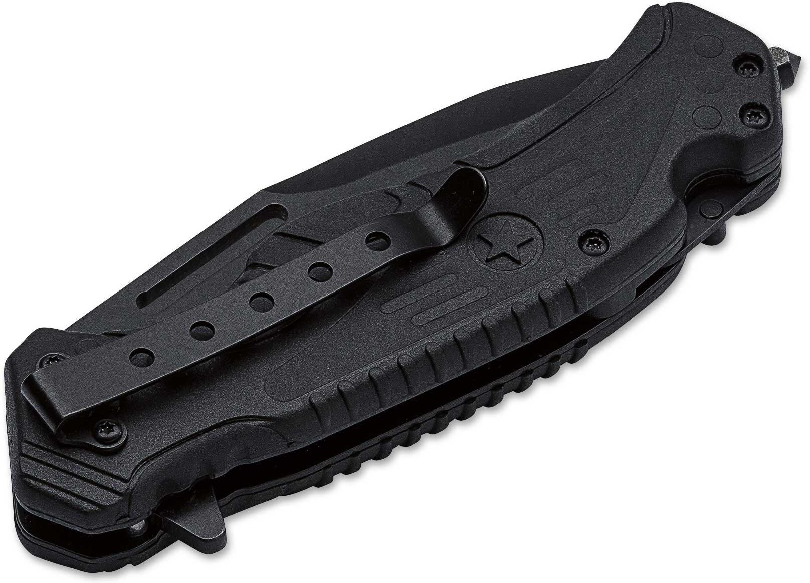 The rescue knife series Boker Plus Savior is intended for private users who want to be equipped in the event of an accident to help themselves or others, but also for professional users who carry the knife on the job as a rescue tool. Solid steel liners carry fiberglass-reinforced plastic scales that feature directly overmolded grip-enhancing TPR rubber inlays in strategic places. This provides secure handling even in wet or cold conditions and in stress situations. The replaceable glass breaker on the pommel reliably punctures any side glass panel, while the retractable belt cutter allows belts to be cut even close to the body without risk of injury. Blade with partial serration and flipper. The knives feature a removable clip (tip-down). Shipped with premium nylon belt pouch.
