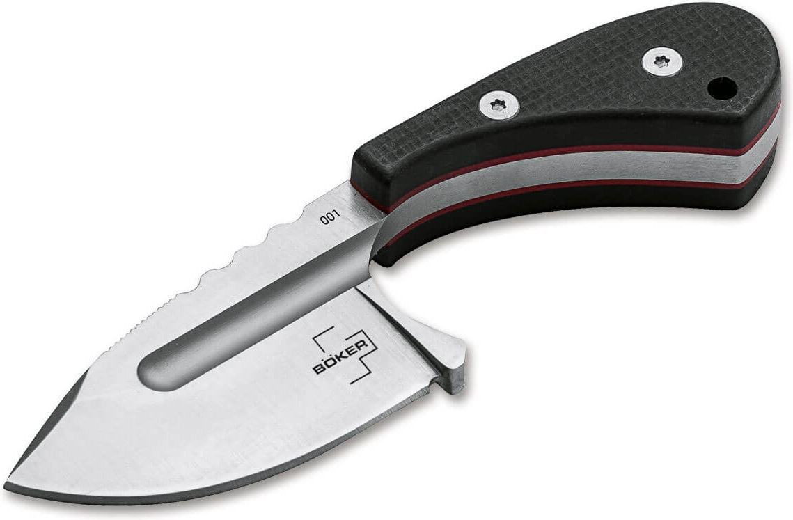 The extremely handy Boker Plus Sigyn is a lightweight neck knife designed by Andre Schröter and, like the previous models of Midgards knives, can be equipped with different handle scales. Using a standard 3D printer, these can be easily printed out by yourself in a wide variety of shapes, colours and materials. The compact three-finger knife comes with an ergonomically shaped handle made of durable G10. The finely textured handle scales lie securely in the hand even when wet and are also provided with a red fibre layer. Jimpings in the area of the thumb rest further increase work safety. The satin-finished Droppoint blade is made of D2 and is equipped with a decorative groove. With a lanyard hole, ball chain and custom-fit Kydex sheath.