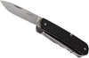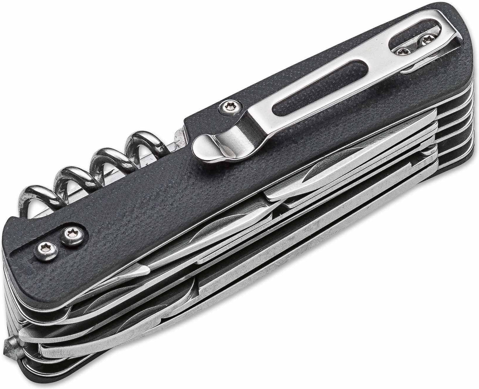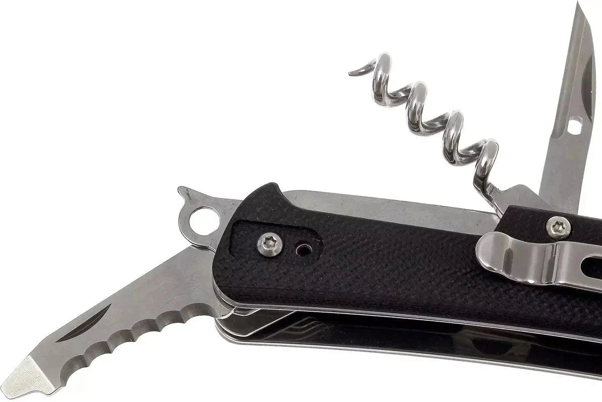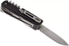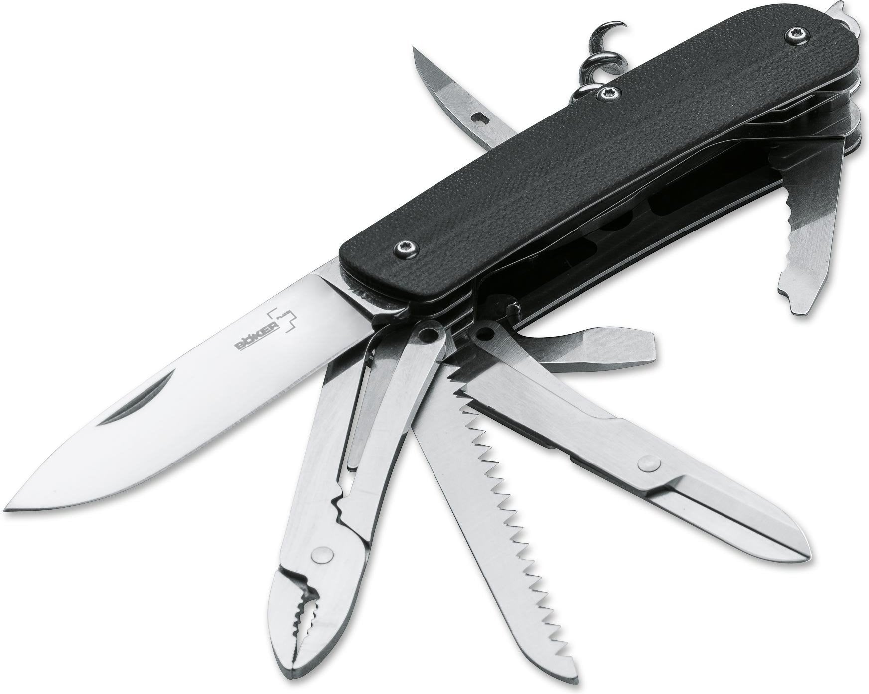 With the Boker Camp Knife, one of the forefathers of all modern multi-purpose pocket knives, our history began in the year 1869. After almost 150 years of successful market presence, the time came to convert this proven concept into a modern knife. The modernized construction, which is based on solid steel liners, is embedded in two contoured handle scales, made out of black G10. The Swedish Sandvik 12C27 steel, with a Rockwell hardness of 58-60 HRC, provides outstanding edge retention of the hollow ground blade. The high quality manufacturing, with a smooth blade action and optimized operability, are proof of the premium quality of our Boker Plus Tech Tools. The hollow ground stainless steel blade is accompanied by these tools: Glass breaker, flat screwdriver with cap lifter and wire stripper, small serrated blade with flat screwdriver, cork screw, lanyard hole, scissors, stitching awl, pliers, wood saw and clip.