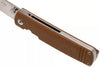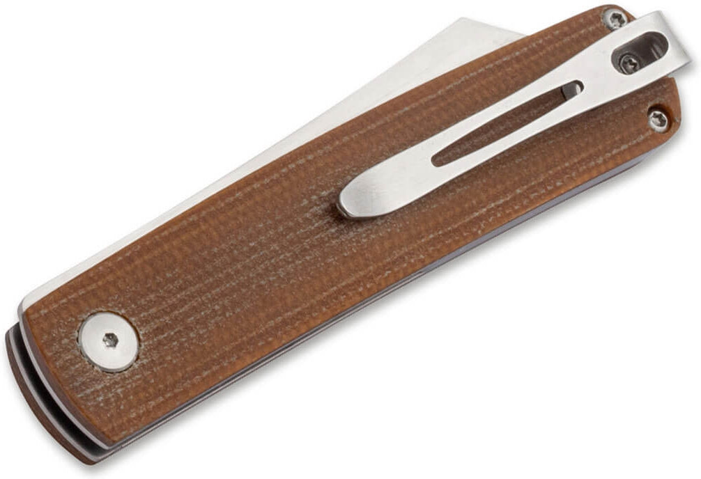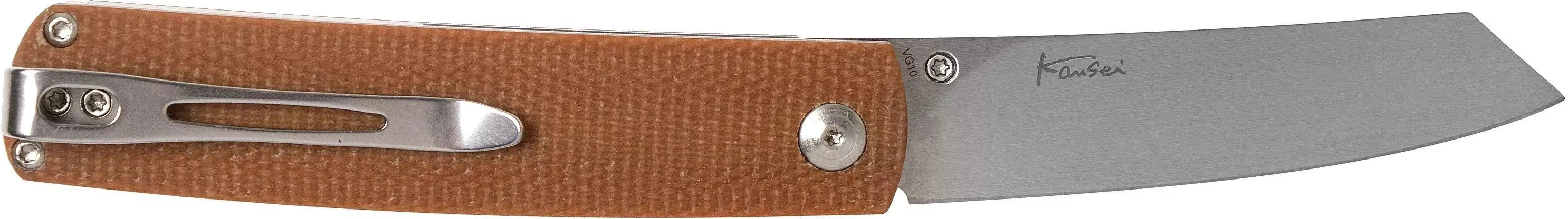 With the Boker Plus Tenshi, Japanese knifemaker Kansei Matsuno has designed another extremely slender gentleman's knife in which he combines Far Eastern style elements with modern construction methods and materials. The compact dimensions of the slightly curved pocket knife are the perfect compromise between pocket suitability and versatility. The modified Tanto blade made of VG-10 with an impressive hairline finish is easy to operate thanks to a thumb stud and ball bearing, while a tried-and-tested linerlock takes care of the locking mechanism. The reddish-brown handle scales are made of hard-wearing Micarta and always lie securely in the hand, even when wet, thanks to the fine texturing. Supplied with a removable deep-carry clip (tip-up/r) and a high-quality nylon pouch for storage.