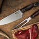 Our Boker Saga chef's knife series - handcrafted by our manufactory in Solingen - raises the bar and brings the topic of "cutting in the kitchen" to a new level. Our decades of experience in the outdoor knife world coupled with the ingenuity and creativity of Danish knifemaker Jesper Voxnaes were incorporated into the concept and design of Saga in an effort to achieve a new level of performance in terms of ergonomics and cutting technology. The carefully orchestrated transfer of this joint know-how into the culinary field is proof that working with Boker Saga will be an entirely unique experience. The softly swung grips are fabricated from exclusive certified imported grenadilla wood. With its high hardness and density, grenadilla wood is a fixture in the European wood instrument making field. The successful ergonomics already become apparent when the Boker Sage knife series is first handled: every curve, every bend in the line nestles itself into place on the hand, conveying absolute control and an exceptional cutting experience. The swallow-tail-shaped flare of the pommel on the larger models enhances grip security.