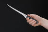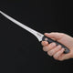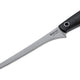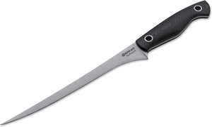 Boker Saga owes its high strength to the full-tang design, which extends over the full length of the knife (in the same manner as on many hunting knives) from the blade tip to the pommel. The optimized cutting performance is not only guaranteed by the full flat grind of the blade with stonewash finish, but also by selecting 440C as the blade steel, which far surpasses the edge-holding and corrosion-resistance of conventional chef's knife steels. This surface finish is achieved in a specialized grinding process and is characterized by outstanding gliding properties through the cutting material, thus enhancing the already superior cutting performance. In addition, the micro-structure of the stonewash finish is extremely scratch-resistant, since these are typically visually absorbed by the texture. A special note is achieved by the large hollow rivets, the unmistakable mark of Jesper Voxnaes. The Fillet Knife is mainly used for filleting fish and therefore belongs to the basic equipment of every angler. It is characterized by a long, narrow and flexible blade. It is also used for other purposes. In the meat, the sharp blade of the Fillet Knife is used to remove tendons or skin, and the pulp of fruit and vegetables can be removed quickly from the core.
