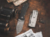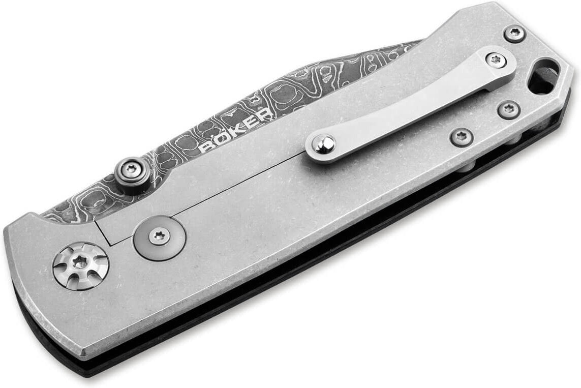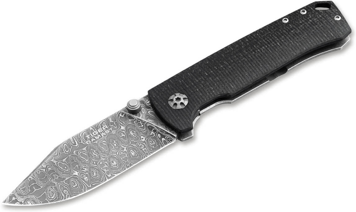 The straight-edged Boker Tiger-Damascus is equipped with a unique damascus blade made from the steel of the battle tank destroyed at Bauska. The non-stainless mosaic damascus is forged for us by hand by Chad Nichols in the Intrepid pattern and is reminiscent of the tank tracks left in the ground by the Tiger's heavy tracks. Unlike conventional damascus, the production of mosaic damascus does not create layers, but complex damascus bars are forged by hand into a mosaic in an elaborate and very complicated process. The ball-bearing blade is opened by a thumb stud and locked by a sturdy steel framelock with a stonewash finish, while a Hinderer lock-stop acts as an over-extension protection for the lock. The overall shape of the knife pays homage to the famous lines of the tank, while the decorative pivot screw is modelled on the main drive sprocket. The slightly contoured handle scales made of burlap micarta are provided with precisely milled grooves, which are reminiscent of the characteristic surface structure of the Zimmerit coating of German armoured vehicles. With lanyard hole and milled clip (tip-up/r) with steel ball. Handmade in the Boker Knife Manufactory in Solingen. Supplied with a classy suspended display, a certificate of authenticity and an individual serial number.