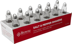 The Browne 1 Oz Salt & Pepper Glass Shaker Tower with Chrome Top (Set of 12) - 575221 is an elegant and practical set of condiment shakers designed for seasoning your meals.Whether you're setting up a restaurant, hosting a special event, or simply looking to elevate your dining experience at home, the Browne 1 Oz Salt & Pepper Glass Shaker Tower with Chrome Top (Set of 12) - 575221 is a practical and aesthetically pleasing choice to enhance your tabletop presentation and seasoning options.