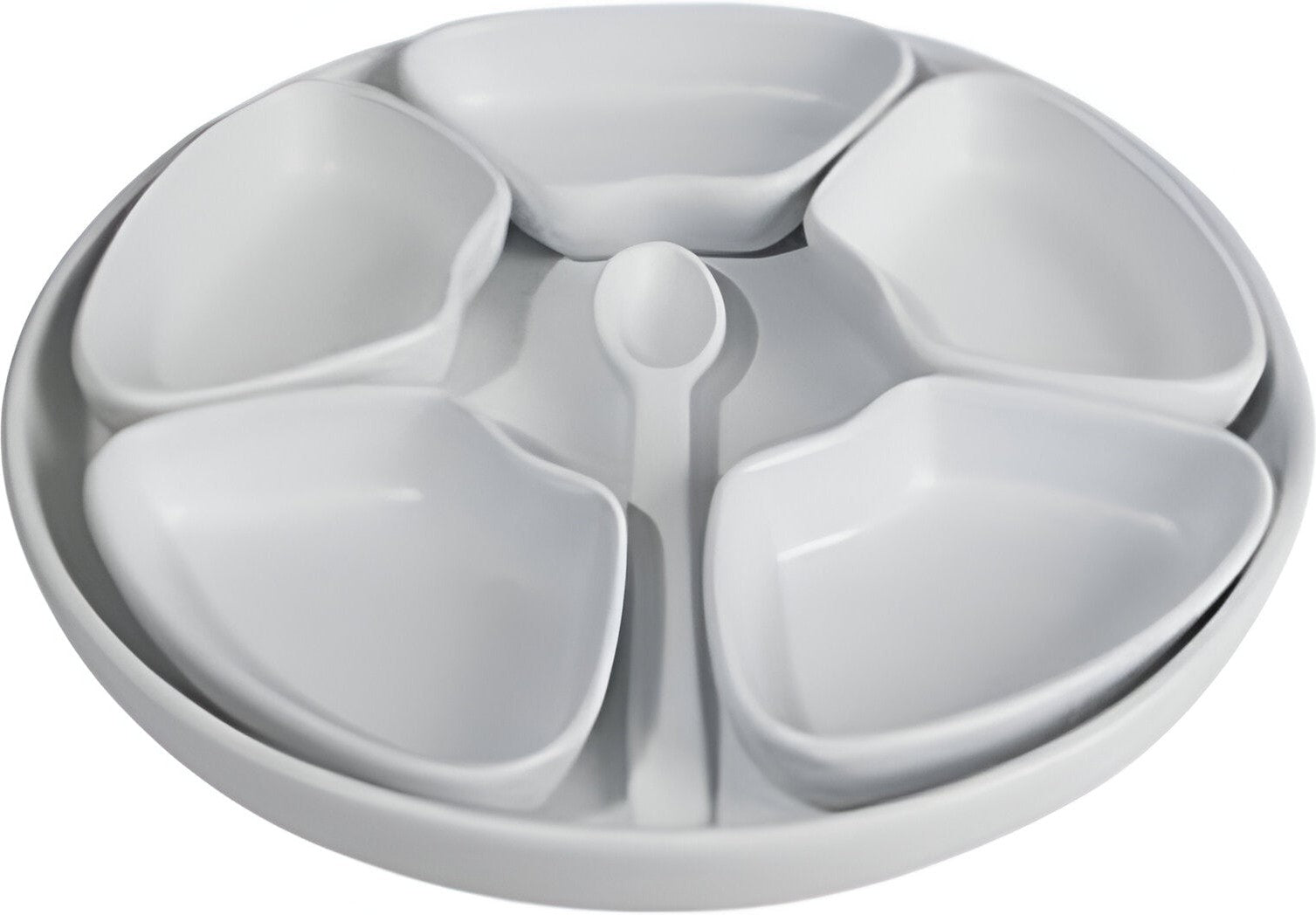 Bugambilia - Mod 12.6" White Round Ramekin Set (Tray, 5 Ramekins and Spoon) With Glossy Smooth Finish - MJ501-MOD-WW