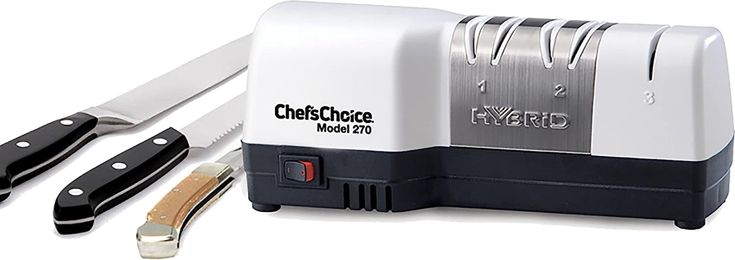 Introducing the Chef's Choice 3-Stage Hybrid Electric Knife Sharpener in White, featuring the cutting-edge CrissCross technology for achieving razor-sharp edges with ease. The new and efficient 3-Stage Chef'sChoice Diamond Hone Hybrid Model 270 is one of the most advanced hybrids yet, combining the acclaimed CrissCross sharpening technology with electric and manual sharpening stages. Experience superior edge geometry and razor-sharp edges on both straight edge and serrated knives, including household and kitchen knives, sports knives, and pocket knives.