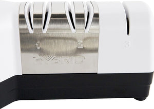 Engineered and assembled in the U.S.A., the Chef's Choice 3-Stage Hybrid Electric Knife Sharpener in White offers a 3-stage sharpening process that combines both electric and manual methods, catering to 20-degree class knives. With 100% diamond abrasives in all three stages, achieve razor-sharp edges in less than 2 minutes for first-time sharpening and resharpening. This sharpener is also ETL approved for Canada, ensuring its quality and safety standards.