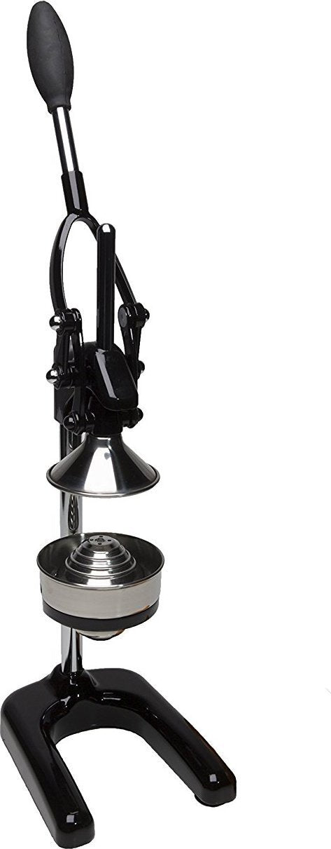 Thanks to the leverage produced by the long, rubberized handle, the fruit practically juices itself while maximizing juice extraction. It can press up to 1,400 pounds per square inch (PSI), making it quick and easy to serve freshly squeezed juice! Rubber feet coupled with a heavy base provide extra stability. Made of cast aluminum; funnel and extractor made of stainless steel. Removable parts are dishwasher safe. 7” x 8½” x 17”.