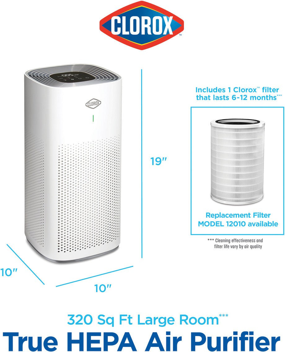 Breathe easier with the Clorox Large Room True HEPA Air Purifier, designed to capture 99.97% of allergens and particulates as small as 0.1 microns, and 99.9% of viruses and bacteria. This powerful air purifier features a 3-stage 360° filtration system that includes a pre-filter, True HEPA filter, and an active carbon filter to eliminate odors, ensuring cleaner, fresher air in large rooms up to 320 sq. ft. Ideal for reducing allergens, pet dander, dust, smoke, viruses, and bacteria, it offers reliable air purification and real-time air quality feedback.