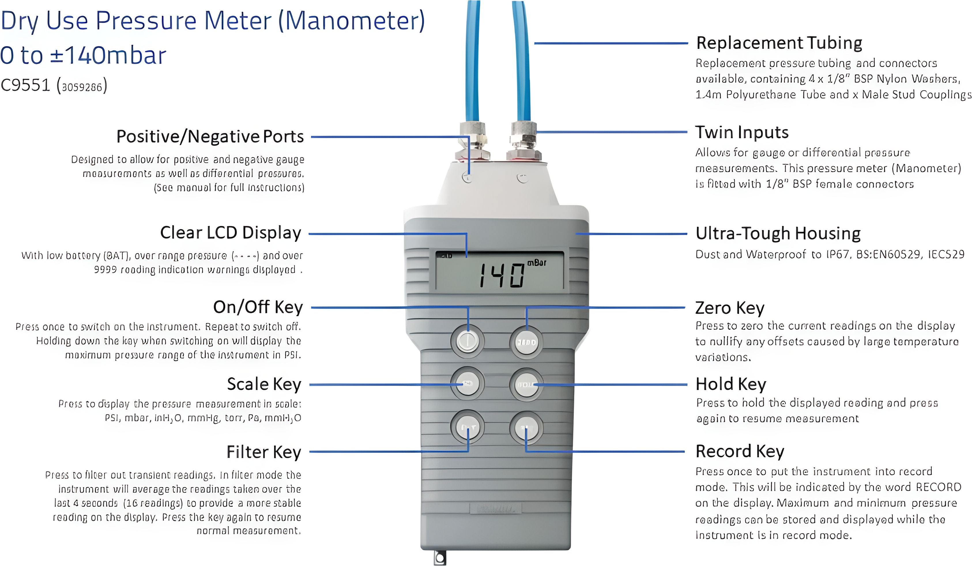 The Comark C9551/SIL Waterproof Pressure Meter 0-to-±140mbar / Waterproof Manometer 0 to ±140mbar combines high accuracy with speed of response and is designed to function between 0 to ± 140mbar. The C9551/SIL Waterproof Manometer features twin inputs for gauge or differential pressure measurement and contains additional silicone protection making it suitable for liquid pressure measurement.
