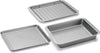 Set includes 12.2" x 8.6" toaster oven baking dish, 10.7" x 12" toaster oven baking pan and 12.4" x 8.6" toaster oven broiler pan with rack.