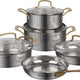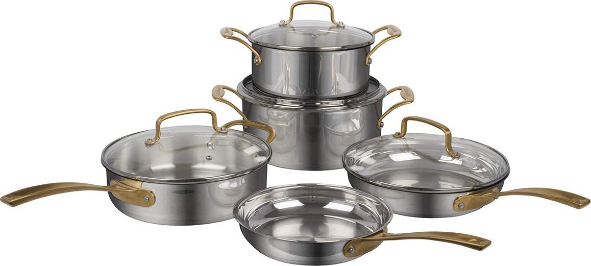 This premium cookware set is constructed with a layer of pure aluminum embedded into gleaming, mirror-finish stainless steel. Home chefs will love the quick heat-up and even heat distribution as well as covers that fit tightly to lock in flavour and texture. Cast gold stainless handles are professionally riveted and contoured for a secure grip which add exceptional style to any kitchen. The set is designed to cook on any stovetop, induction ready, and oven-safe to 500°F(260°C) Glass Lids 350°F (176°C).