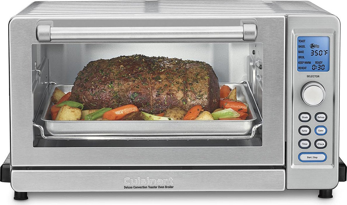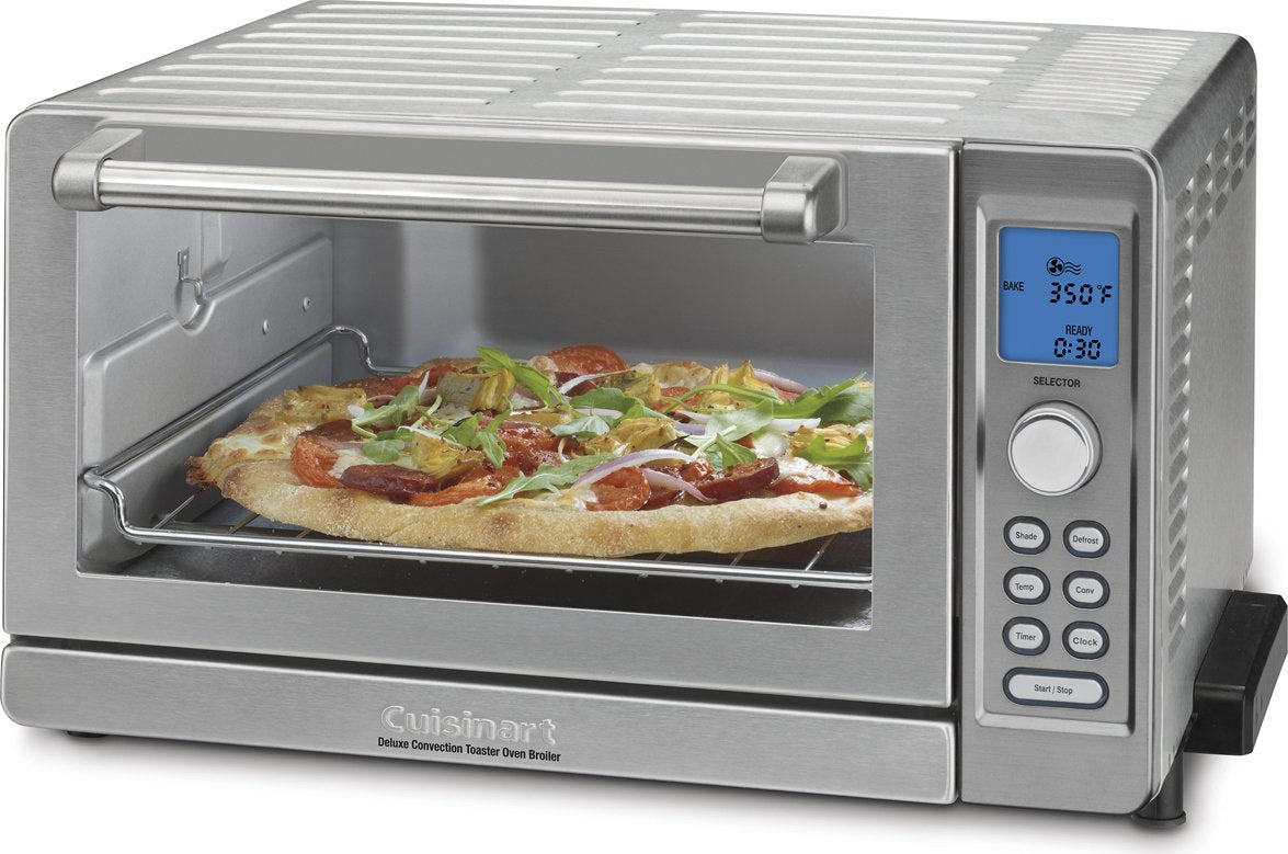 The Cuisinart Deluxe Convection Toaster Oven Broiler is designed with 9 functions, including convection for making delicious cakes, potatoes and roasts. Sized to accommodate a whole chicken, a 12-inch pizza, or 6 slices of bread, the unit is controlled by an electronic dial and LED buttons. The large blue back-lit LCD allows for the quick and easy setting of function, temperature, and cook time. The Exact Heat sensor maintains precise oven temperatures, and the Always Even shade control ensures that toast consistently turns out the selected shade.