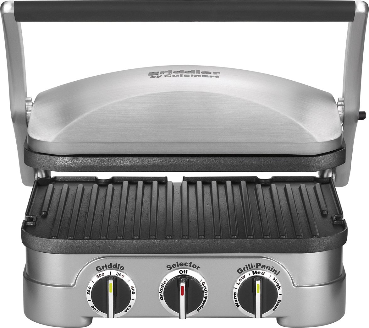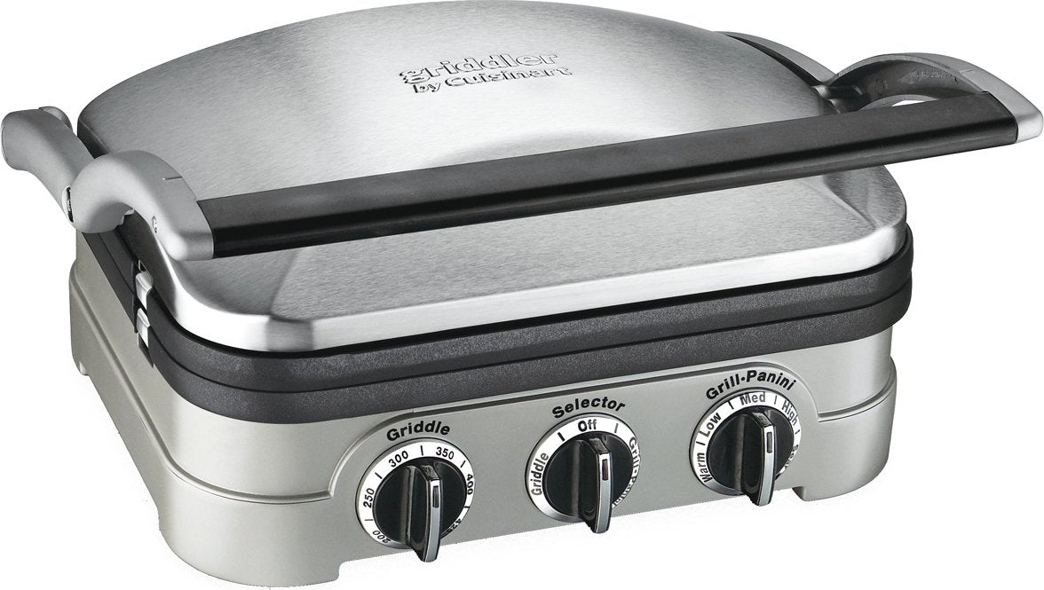 The Cuisinart Griddler takes multifunctional to a whole new level! With five cooking options, it can handle everything from pancakes & sausages to grilled cheese, steaks, hamburgers and panini. A floating cover and one set of reversible plates that snap in and out turn the Griddler into a Contact Grill, a Panini Press, a Full Grill, a Full Griddle, or Half Grill / Half Griddle. Dual temperature controls ensure everything is perfectly cooked!
