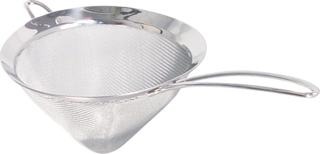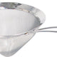 Cuisipro 7" Stainless Steel Cone-Shaped Strainer – a versatile kitchen tool designed for precision straining, ideal for stocks, soups, and culinary creations where flavor and consistency are paramount. Crafted with a unique cone shape, this strainer efficiently directs liquids downward, ensuring precise and thorough straining without unwanted debris or bits. It's perfect for achieving smooth and flavorful dishes, particularly when removing peels, bones, and other components. The deep-seated design of this strainer allows it to sit securely in your stock pot or large bowl, preventing spills and messes during the straining process. Equipped with a cool-touch loop handle and a smaller loop for securing over the edge of your container, this strainer offers comfortable and stable handling, even with hot liquids.