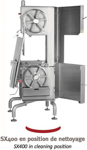 This band saw is made of 18/10 stainless steel. It features a strong, thick perfectly rigid frame and automatic blade stretcher. The sliding upper blade guide stays in an automatic position. This unit is very easy to maintain as the tipping table allows perfect accessibility for cleaning, while the motor and electrical components are protected from water.