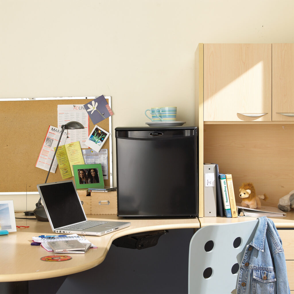 Perfect for dorm rooms, offices, apartments, and wet bars, the Danby 1.7 cu. ft. compact refrigerator offers practical storage with style. This energy-efficient unit features automatic defrost, a mechanical thermostat, and a scratch-resistant worktop, making it both reliable and versatile. Enjoy flexible storage options with full- and half-width wire shelves, tall bottle storage, and Danby's patented CanStor® beverage dispensing system. Its sleek black finish, integrated handle, and reversible door hinge offer a clean, user-friendly design. Backed by an 18-month warranty, this freestanding fridge keeps your snacks and beverages conveniently cool.
