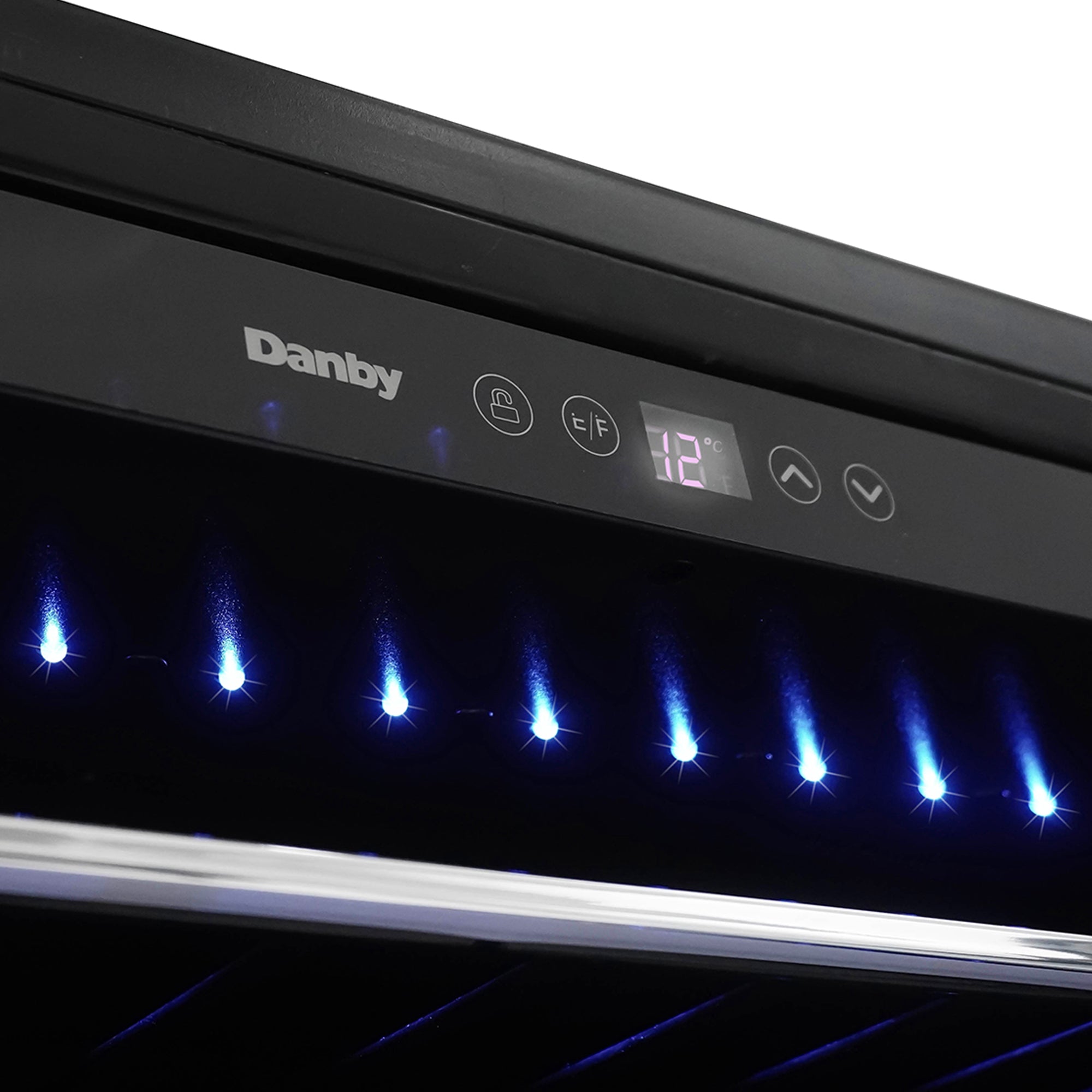 Enhance your kitchen or home bar with the Danby 60 Bottle Built-In Wine Cooler, a stylish and functional solution for wine storage. With a spacious 5.7 cu.ft. capacity, this cooler holds up to 60 (750 ml) bottles of red or white wine. Its fan-forced cooling system ensures consistent internal temperatures, and the digital thermostat with a blue LED display lets you easily adjust and monitor your settings between 41°F and 64°F (5°C – 18°C). Built for convenience and efficiency, the unit includes a temperature memory feature that restores the last settings after a power failure. The elegant stainless steel frame, dual-pane glass door, and modern blue LED interior lighting beautifully showcase your collection. Designed for built-in under-counter installation, it also features a reversible door for flexible setup and a 12-month in-home warranty.