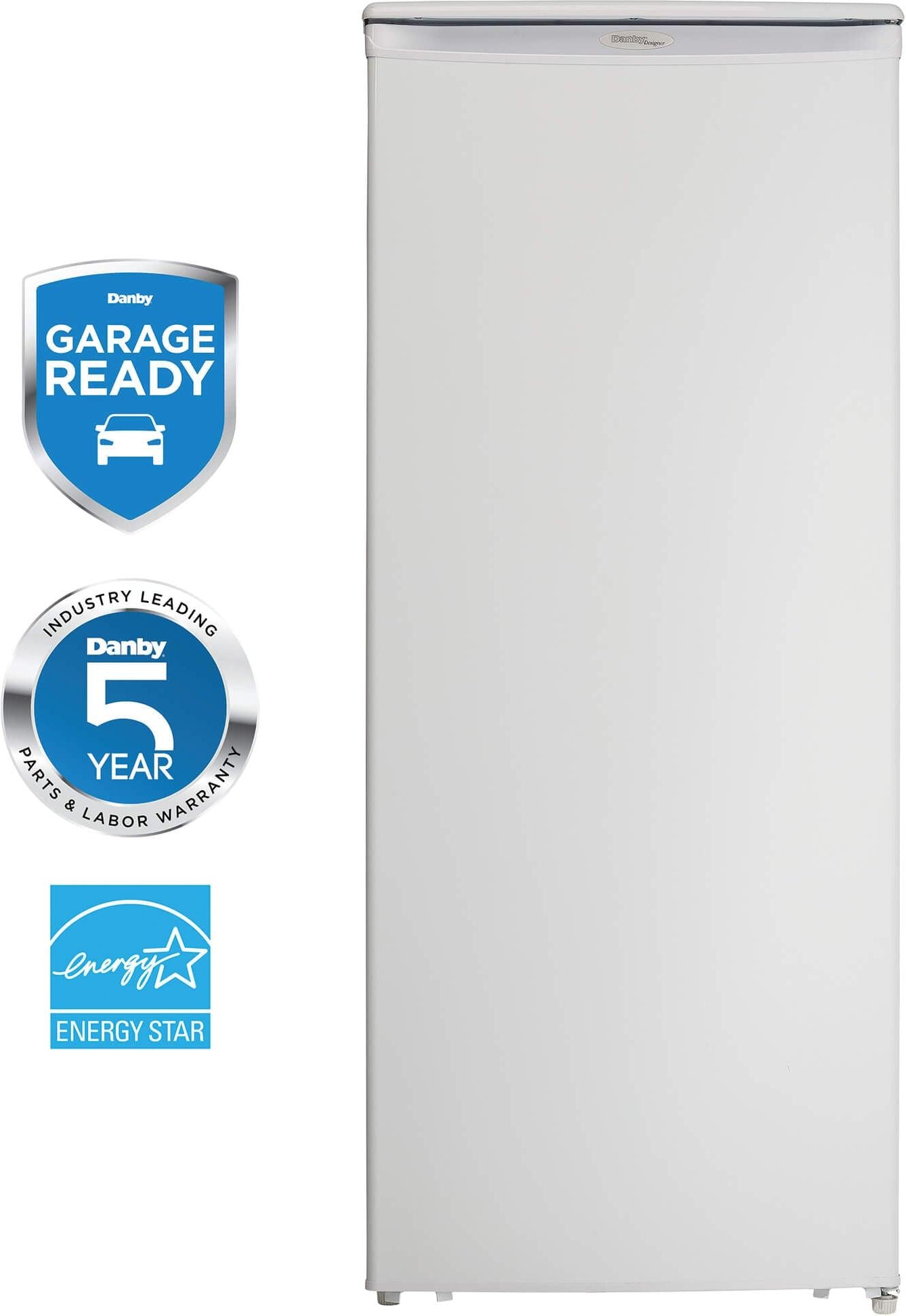 Add reliable freezer storage to your home with the Danby Designer 10.1 cu. ft. Upright Freezer. With a spacious and thoughtfully organized interior, this unit offers three quick-freeze shelves and four door bins for convenient access to frequently used items. Its ENERGY STAR® certification ensures energy efficiency without sacrificing performance, while the manual defrost function and built-in drip tray make maintenance easy. Designed to perform in extreme temperatures from 0°F to 110°F, it’s garage ready for year-round use. The freezer’s modern white finish, reversible door hinge, scratch-resistant worktop, and integrated door handle add functionality and style to any space. Backed by an industry-leading 5-year in-home warranty for added peace of mind.
