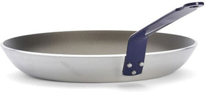 de Buyer - 12.5" Choc Non-Stick Fry Pan with Blue Handle (32 cm), a versatile and professional-grade pan designed to elevate your cooking experience. Whether you're delicately cooking or reheating dishes, this pan's exceptional features make it a valuable addition to your kitchen. The pan's unique Lyonnaise shape is not only visually appealing but also highly functional. It allows your culinary creations to slide effortlessly onto a plate, ensuring a touch of elegance in every dish. Built with Choc 5 HACCP undeformable cookware technology, this pan ensures a steady and even rise in temperature, resulting in consistent heat distribution across its skirt. The reinforced bottom of the pan guarantees a smooth and flat cooking surface, ensuring that your food cooks perfectly every time.